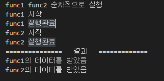 실행결과 func1과 func2는 동시에 실행되었으나, 데이터는 앞서 실행된 func1의 데이터를 func2의 데이터보다 먼저 받은 것을 확인할 수 있다.