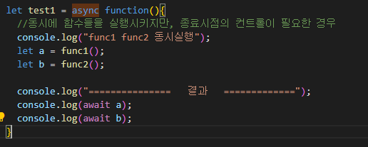 let func1 = function(){ console.log("func1 시작"); return new Promise(resolve => { let resolveData = "func1의 데이터를 받았음"; setTimeout(() => { resolve(resolveData); console.log("func1 실행완료"); }, 2000); }); }; let func2 = function(){ console.log("func2 시작"); return new Promise(resolve => { let resolveData = "func2의 데이터를 받았음"; setTimeout(() => { resolve(resolveData); console.log("func2 실행완료"); }, 1000); }); }; let test1 = async function(){ //동시에 함수들을 실행시키지만, 종료시점의 컨트롤이 필요한 경우 console.log("func1 func2 동시실행"); let a = func1(); let b = func2(); console.log("=============== 결과 ============="); console.log(await a); console.log(await b); } let test2 = async function(){ //순서대로 함수를 실행시켜야 하는 경우 console.log("func1 func2 순차적으로 실행"); let a = await func1(); let b = await func2(); console.log("=============== 결과 ============="); console.log(a); console.log(b); } (async () => { let aa = await test1(); let bb = await test2(); })반응형'JavaScript' 카테고리의 다른 글
