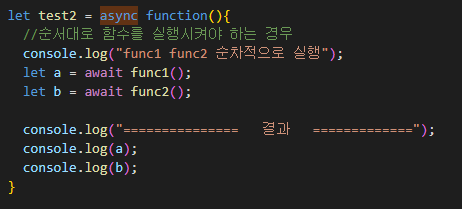 func1, 2를 호출할 때 await 속성을 각각 지정하면 위의 결과와 같이, 순서대로 실행되는 모습을 확인할 수 있다.