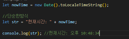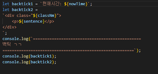 백틱이란 방법으로, 키보드의 ~ 버튼으로 문장을 감싸주는 방식이다.