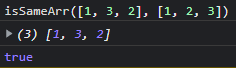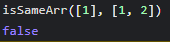 function isSameArr(arr1, arr2){ //두 배열의 길이가 다르면 if(arr1.length !== arr2.length){ return false; } // 길이가 같은 경우 비교 else if(arr1.length === arr2.length){ let filter = arr1.filter(x => arr2.includes(x)); console.log(filter); if(filter.length === arr1.length){ return true; } else return false; } }반응형'JavaScript' 카테고리의 다른 글