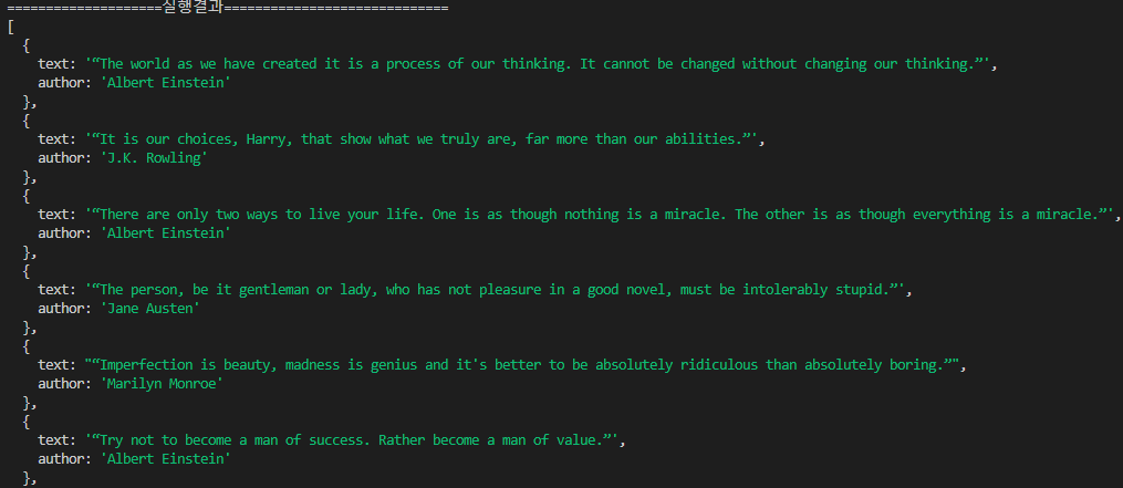 import puppeteer from "puppeteer"; const getQuotes = async () => { // Start a Puppeteer session with: // - a visible browser (`headless: false` - easier to debug because you'll see the browser in action) // - no default viewport (`defaultViewport: null` - website page will be in full width and height) const browser = await puppeteer.launch({ headless: false, defaultViewport: null, }); // Open a new page const page = await browser.newPage(); // On this new page: // - open the "http://quotes.toscrape.com/" website // - wait until the dom content is loaded (HTML is ready) await page.goto("http://quotes.toscrape.com/", { waitUntil: "domcontentloaded", }); // Get page data const quotes = await page.evaluate(() => { // Fetch the first element with class "quote" // Get the displayed text and returns it const quoteList = document.querySelectorAll(".quote"); // Convert the quoteList to an iterable array // For each quote fetch the text and author return Array.from(quoteList).map((quote) => { // Fetch the sub-elements from the previously fetched quote element // Get the displayed text and return it (`.innerText`) const text = quote.querySelector(".text").innerText; const author = quote.querySelector(".author").innerText; return { text, author }; }); }); // Display the quotes console.log("====================실행결과============================="); console.log(quotes); // Close the browser await browser.close(); }; // Start the scraping getQuotes();실행결과 :